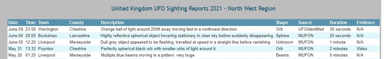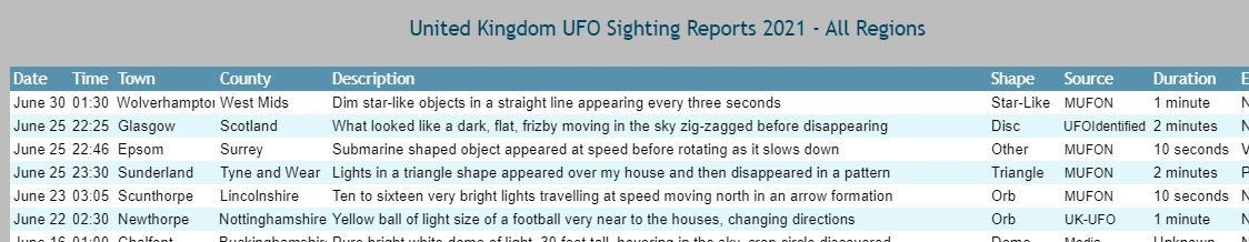 Our database is an overview of UFO sightings reported in the United Kingdom since 2021. Updated weekly from a wide variety of sources, we believe this to be the biggest collection of current-day sightings available. There are lots of different UFO organisations in the UK who collect their own details of sighting, so we have done the leg work of collating all this information into one easily-viewable database.
